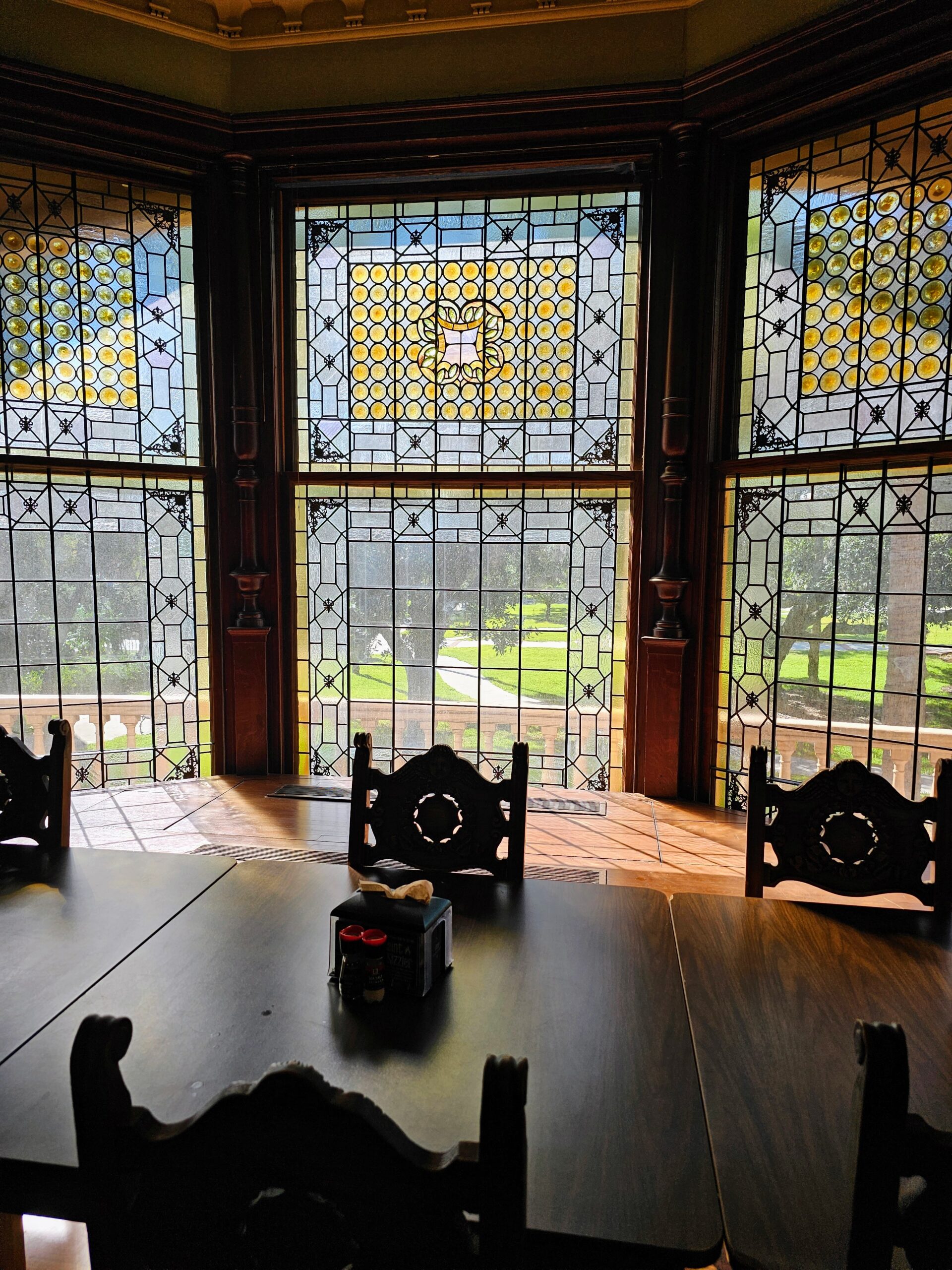 We were then taken to the Dining Room which served 300 seated guests, each table with their own waiter. The more than 40 windows in this room were all created by Tiffany. The exterior of these windows are all covered by bulletproof glass to ensure they aren’t damaged by a hurricane.