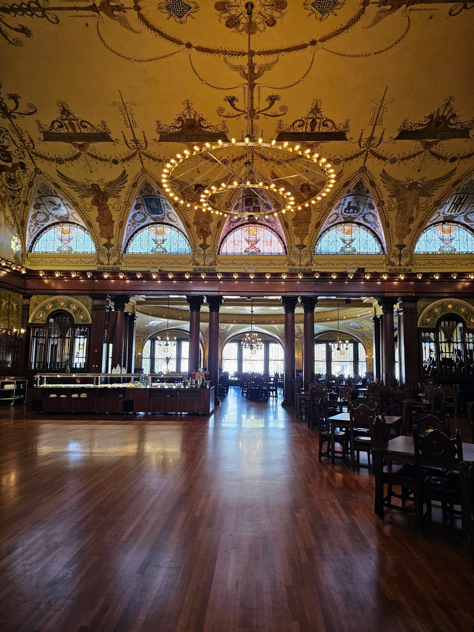 Tiffany also created this unique chandelier in the middle of the dining room, as well as the sconces that line the wall around the room. This is now the dining room for the students at Flagler.