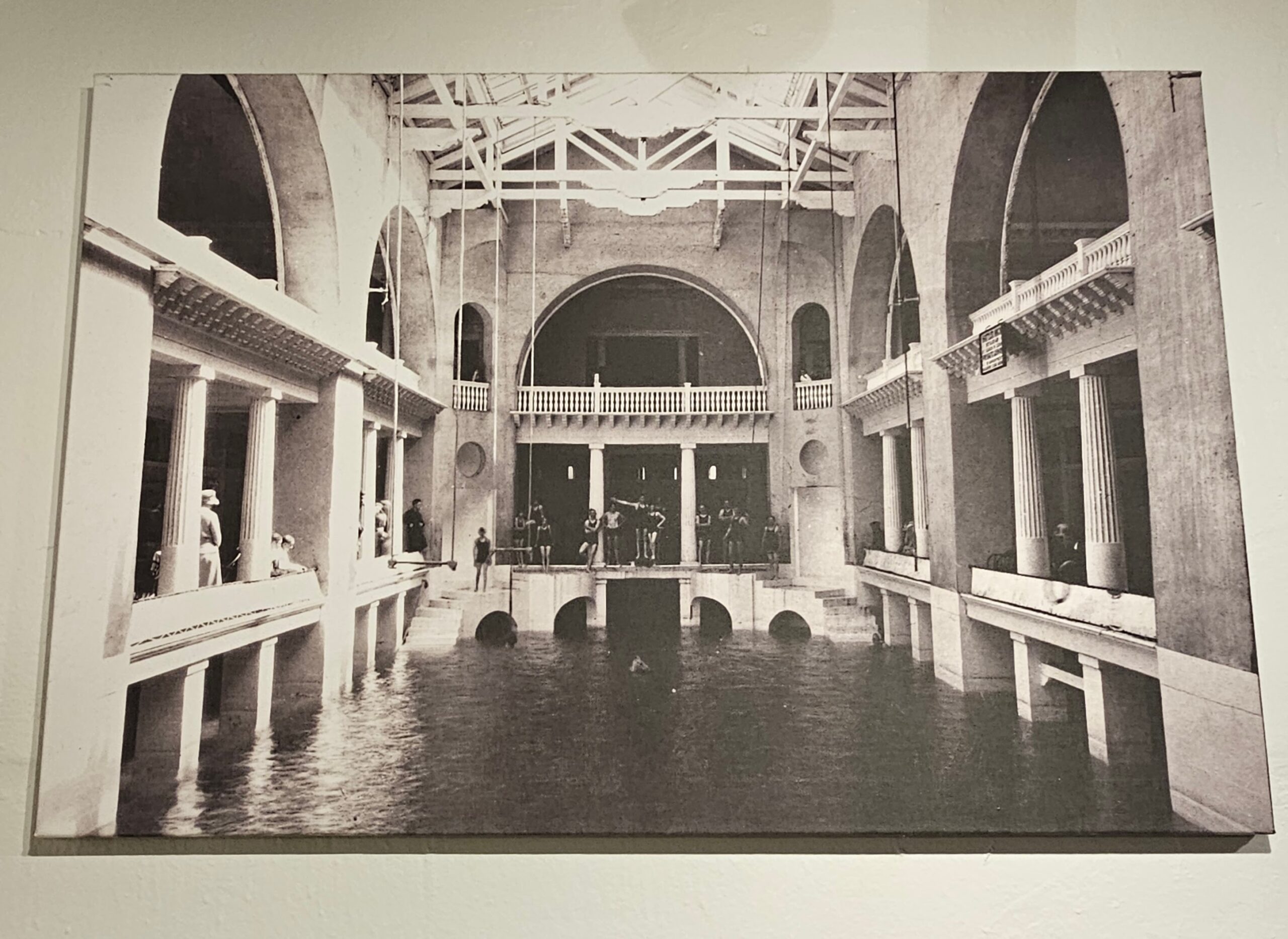 This photo shows what the pool looked like in 1889. At that time it was the largest indoor swimming pool in the world! More than just for swimming, the pool was used for entertainment, with high dives, swings hanging from the rafters, water polo and bathtub races.