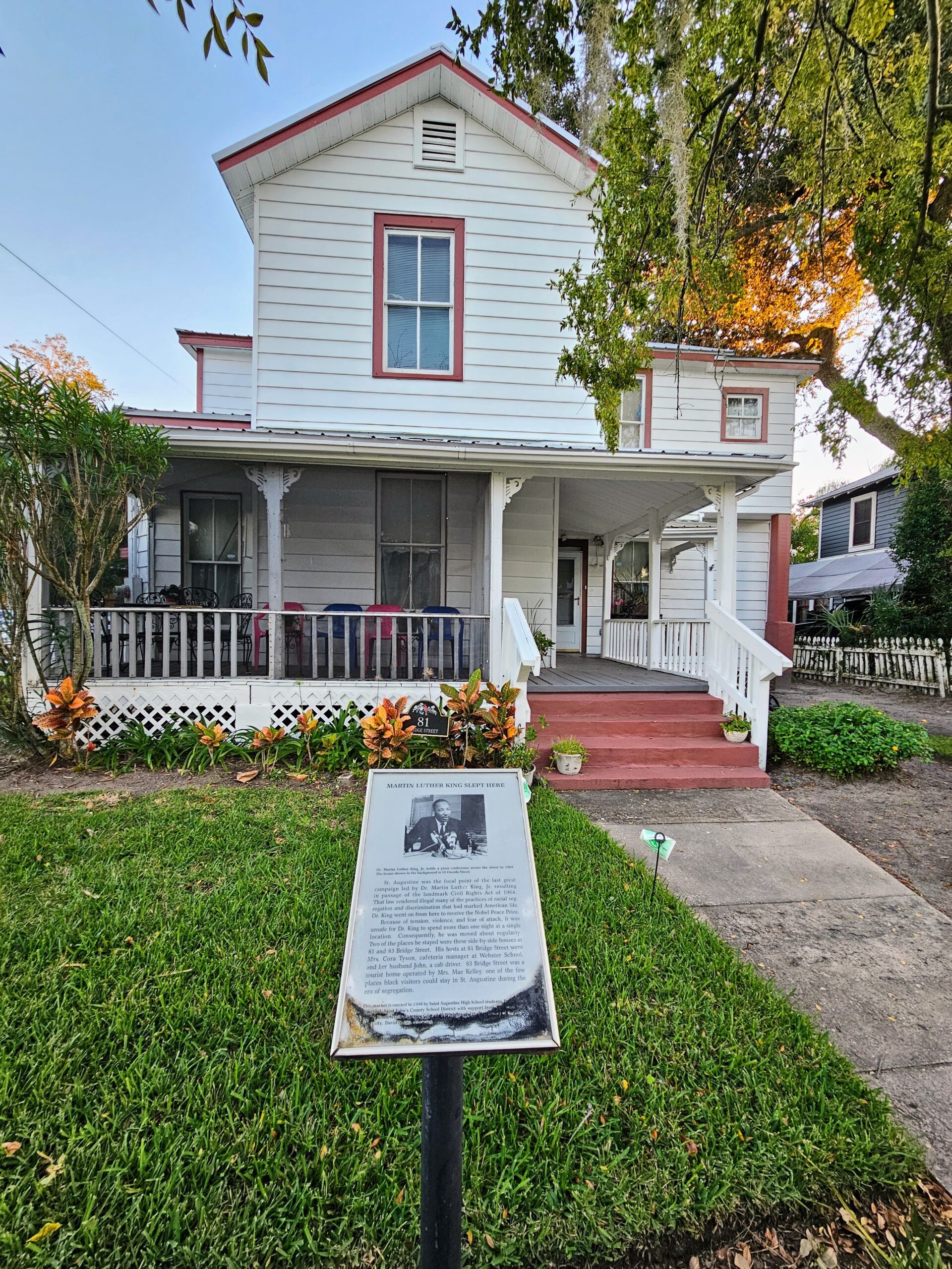On our last night we walked to a restaurant in the Lincolnville Historic District, where many civil rights demonstrations were held in 1964. This house is owned by Cora Tyson, who hosted Martin Luther King several times when he stayed in St. Augustine, and made it his local headquarters. The home was once firebombed and King himself was assaulted here. Cora Tyson is 102 years old and still lives here.