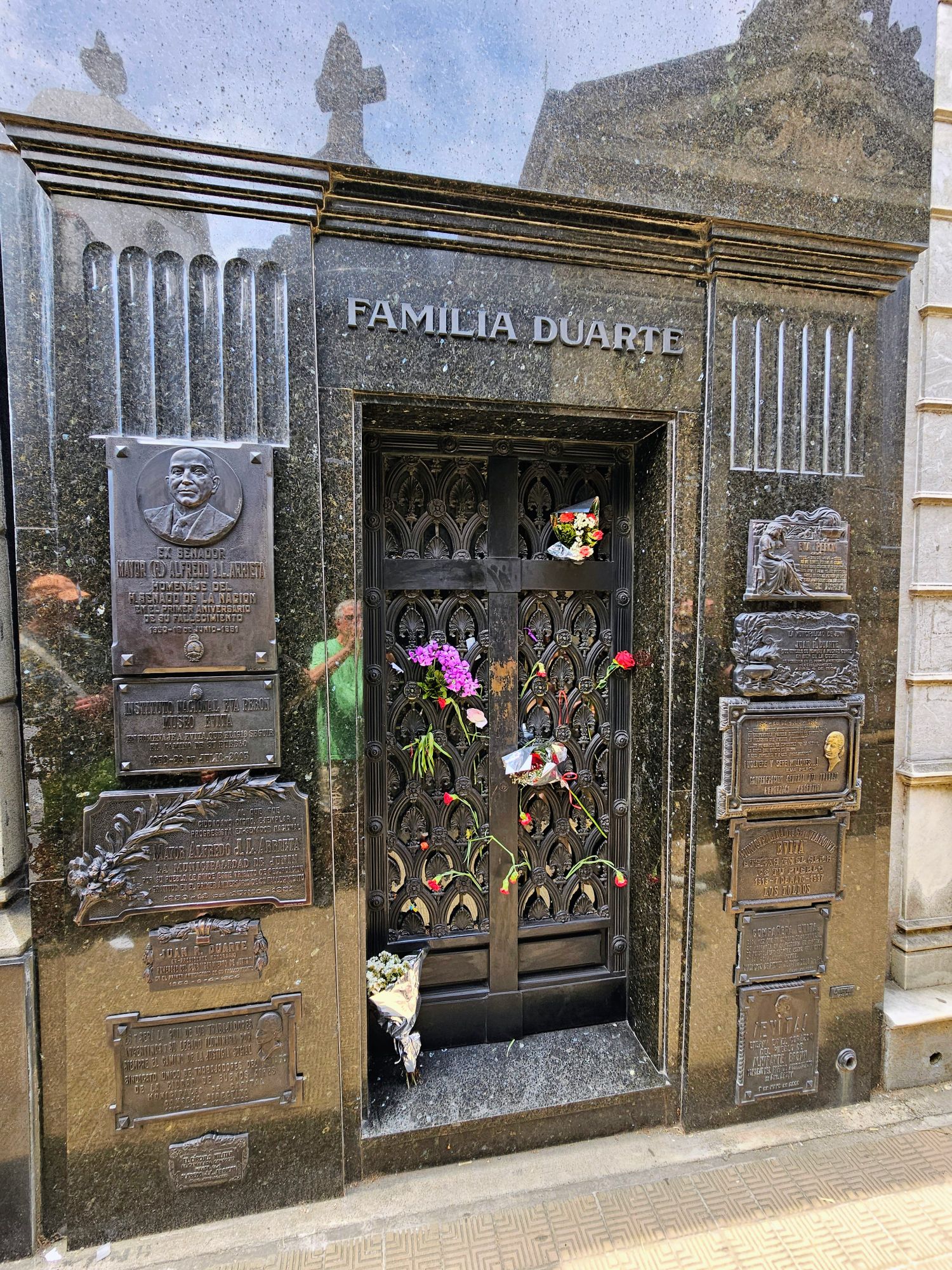 She was buried under a false name (Maria Maggi) in the Milan Monumental Cemetery, a very cool cemetery mentioned previously that we visited a few years ago. In 1971 her remains were exhumed and returned to her former husband who was living in exile in Madrid. Her body finally made it to her birth family’s “Duarte Family” mausoleum here in Recoleta in 1976.