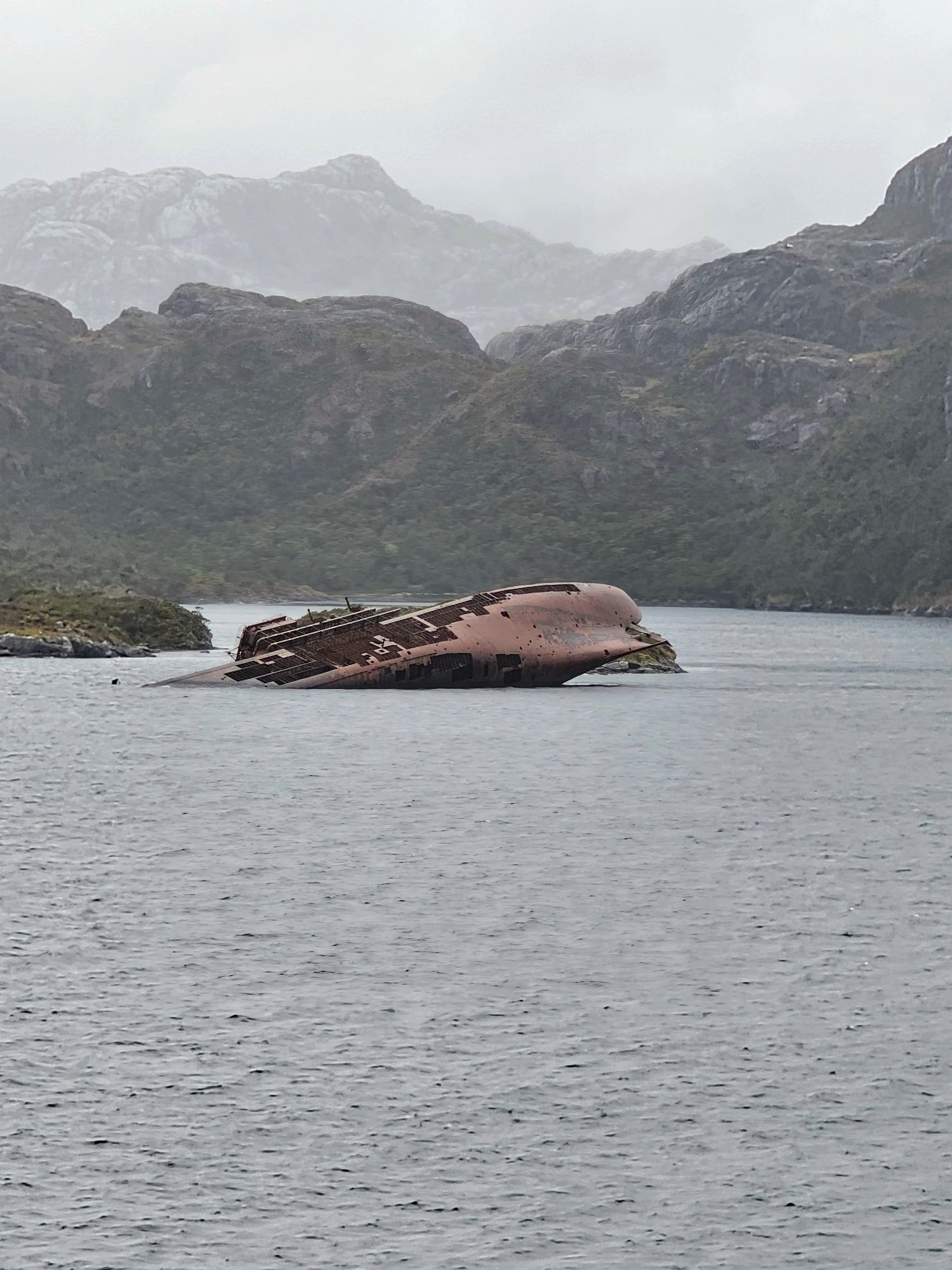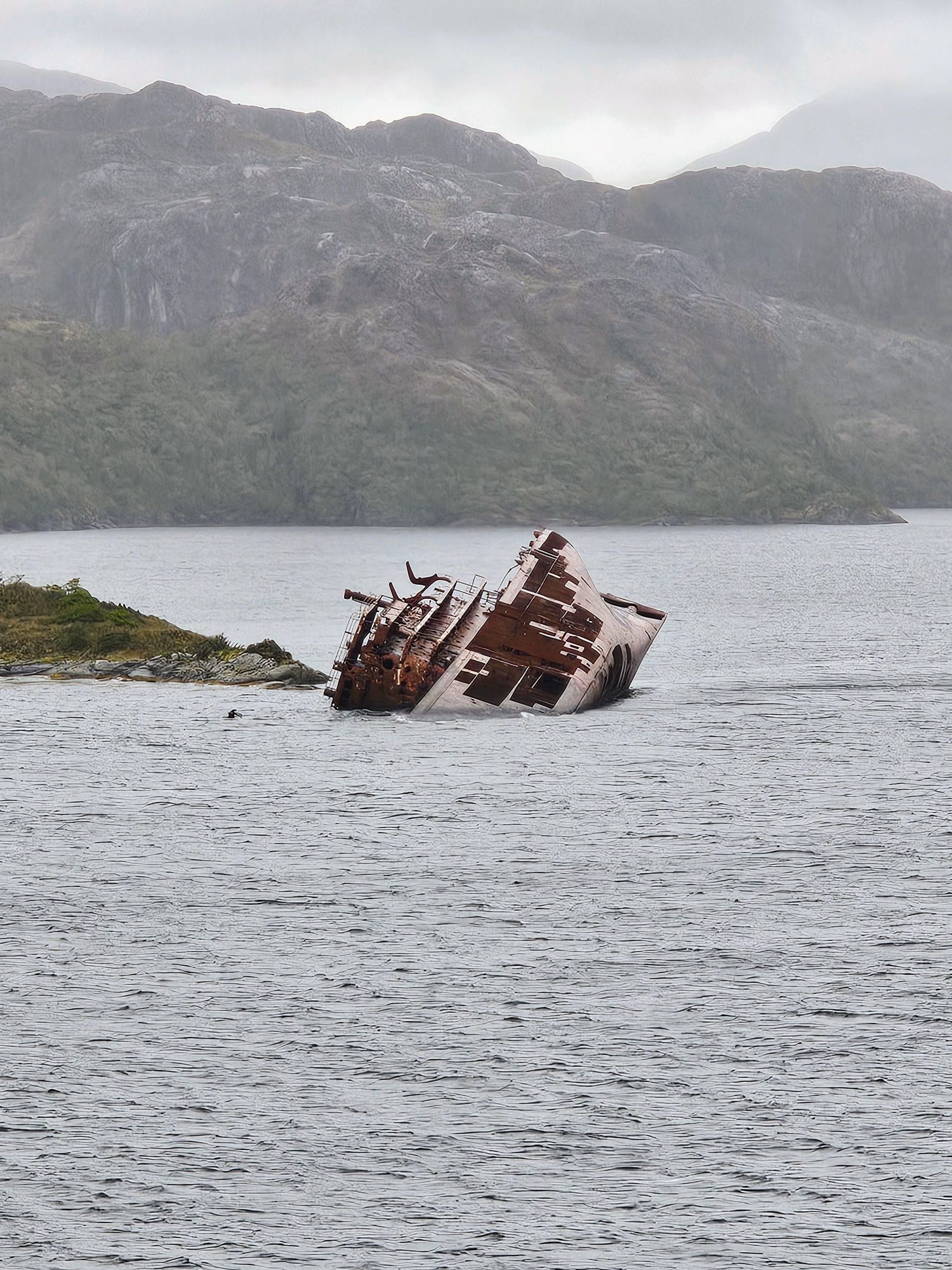 After departing Punta Arenas our ship spent two days cruising the Chilean fjords. While these fjords are pretty, they are nothing compared to the Norwegian fjords. Regardless, there were some interesting spots along the way. As I was watching the scenery go by I spotted this shipwreck.