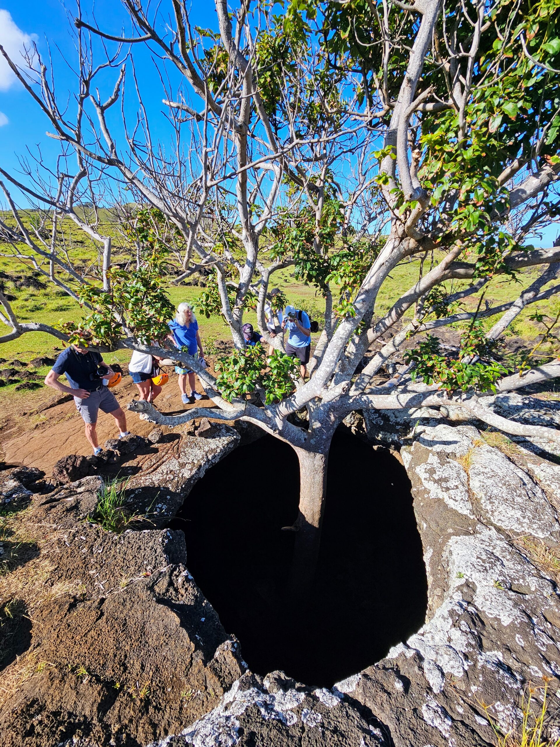Despite having so much to see on the island, Explora didn’t require us to get up at the crack of dawn, which was nice. Our first excursion departed at 0930, and our van took us to Ana Te Pahu, a site with a network of lava tube caves. It’s a short hike from the entrance to the caves, and along the way there are several points of interest. Our guide Ricky pointed out this unusual looking piece of carved volcanic rock that was once a corner of a Rapa Nui building. You can see several other blocks in the background. These small holes carved into the blocks allowed pieces to be fitted together much like Legos.