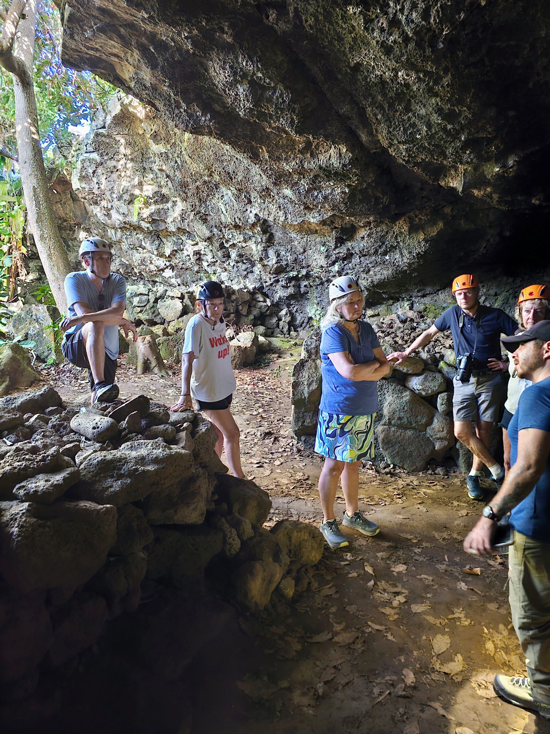 Here we are just inside the cave entrance. The helmets were a very good idea, as there were spots where we actually needed them. Some of the natives lived in these caves, and they built up rock piles that they would sleep on during rainy weather when the caves would flood.
