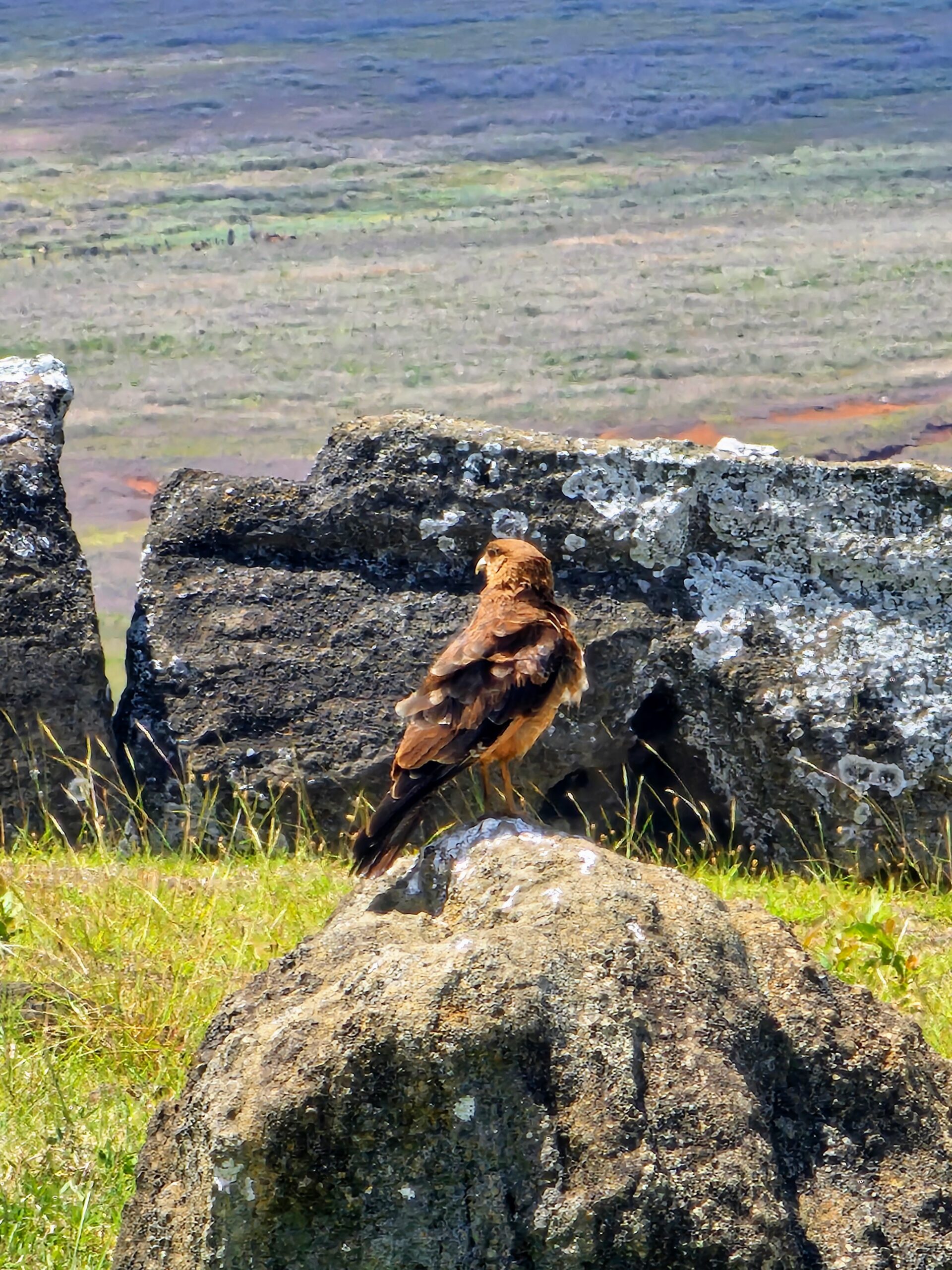 This Chimango Caracara was posing in front of a fallen moai.