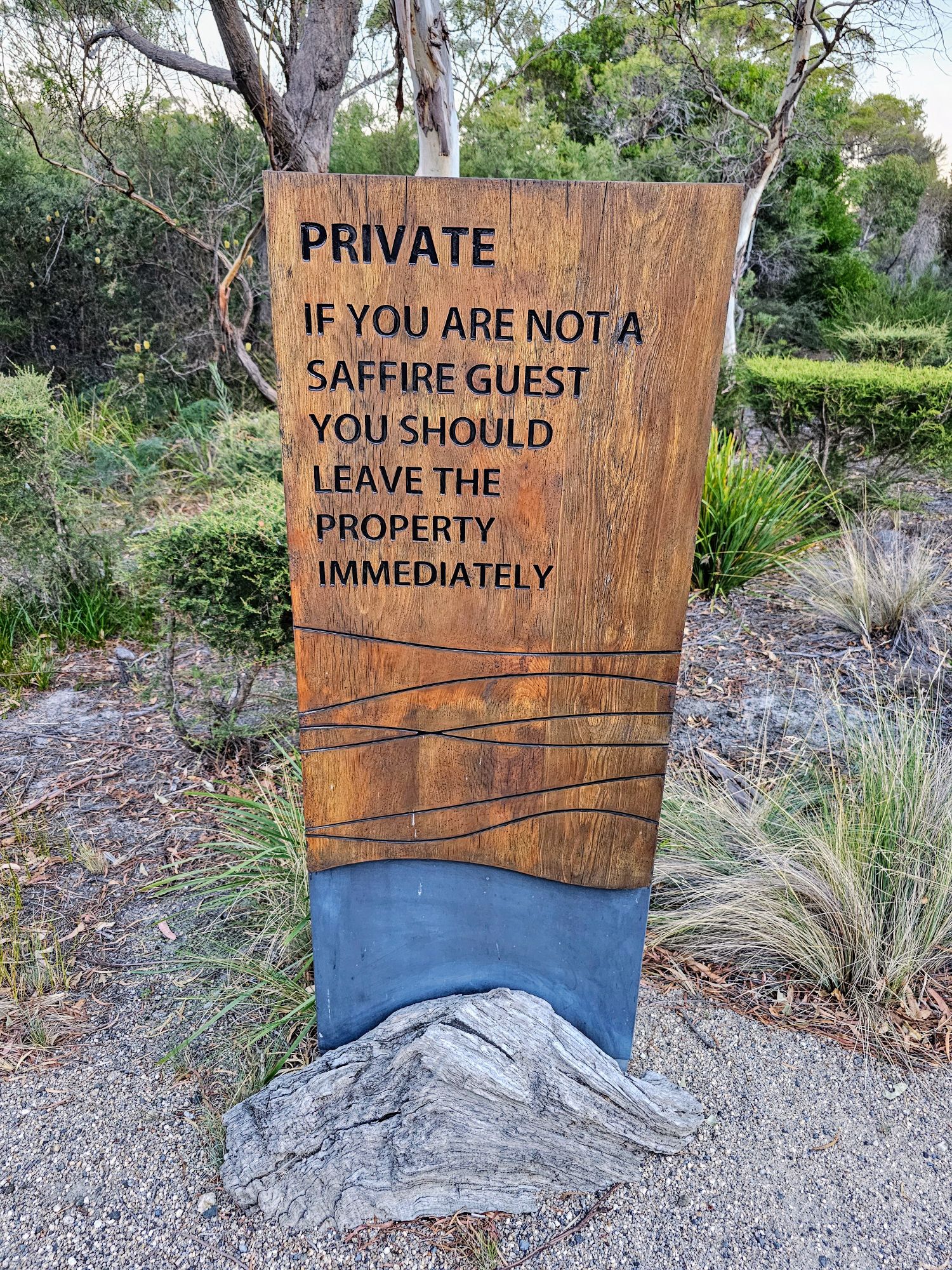 I had to take a shot of this sign you see as you enter Saffire Freycinet. There is one at the main entrance that says “private property, guests only”, and then a little ways in there is this one, just to make sure the message gets across.