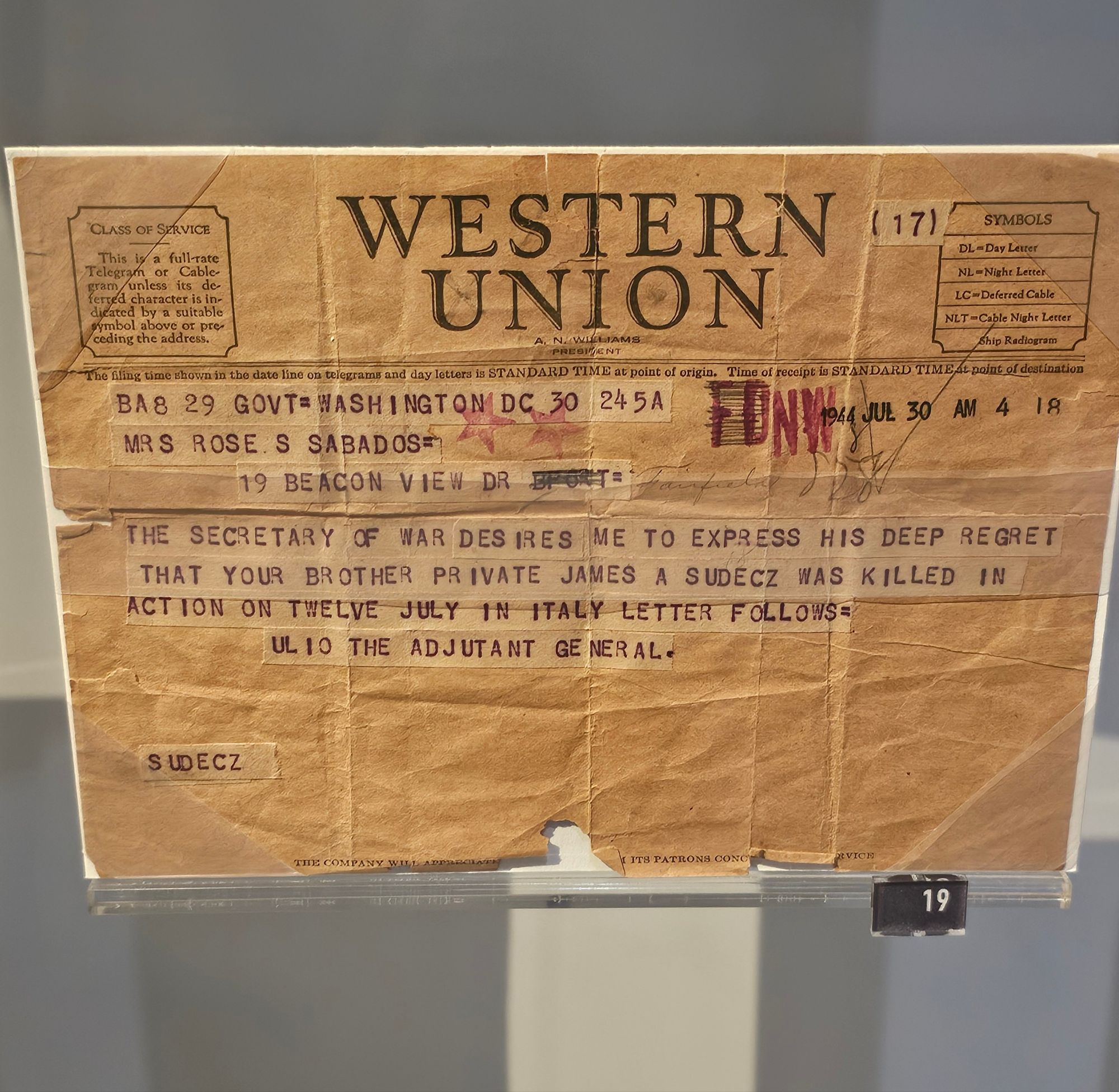 Below is an actual Western Union telegram sent to the family of Private James A. Sudecz, killed in action in Italy on July 12, 1944. These telegrams were sent out to far too many families.