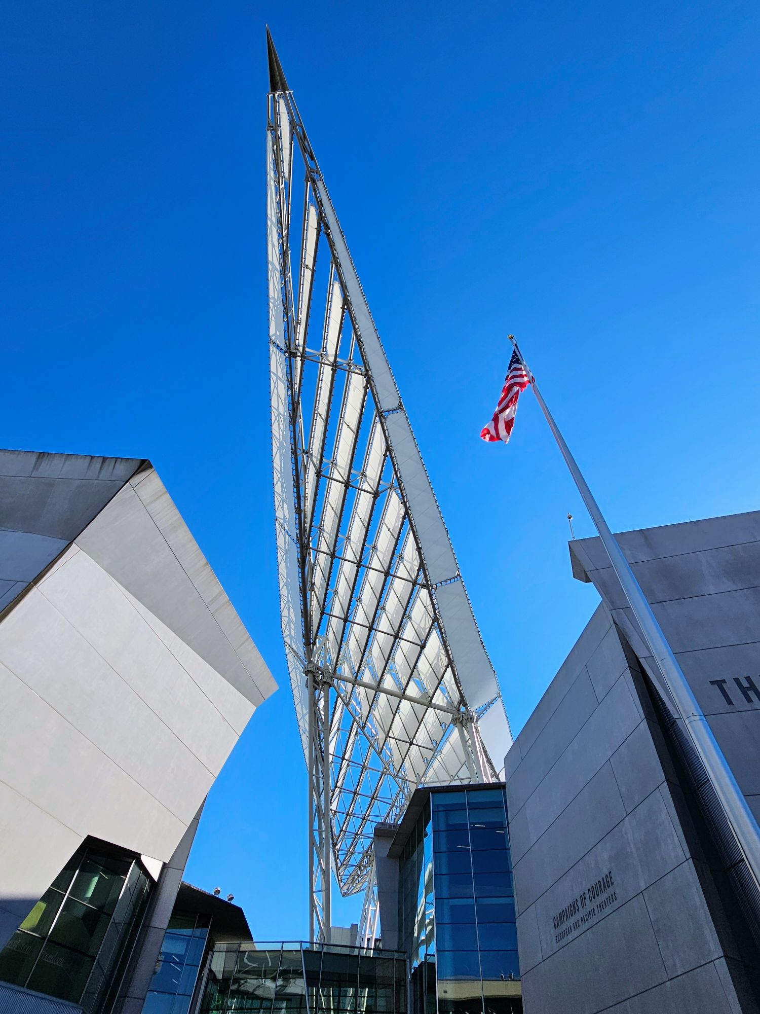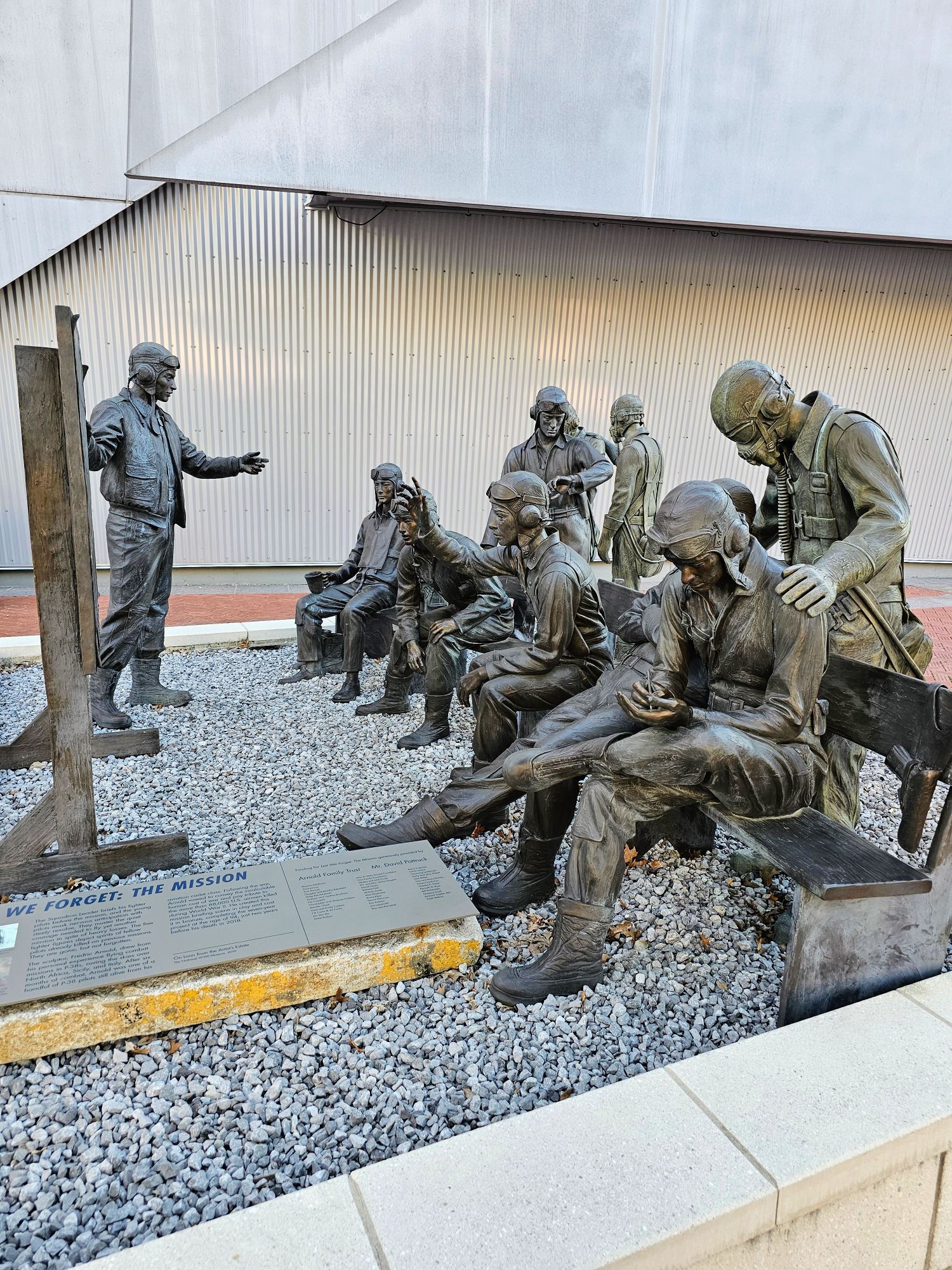 Just outside the museum is this set of statues, called “Lest We Forget: The Mission”. The sculptor, Fredric Arnold, drew from his personal experience flying P-38’s, and was one of the few pilots to survive from his aviation class. Following the war, he vowed to convey the incalculable cost of war and pay tribute to the 88,000 U.S. Airmen killed during WWII. He completed this seven year project at the age of 94, just two years before his death in 2018.
