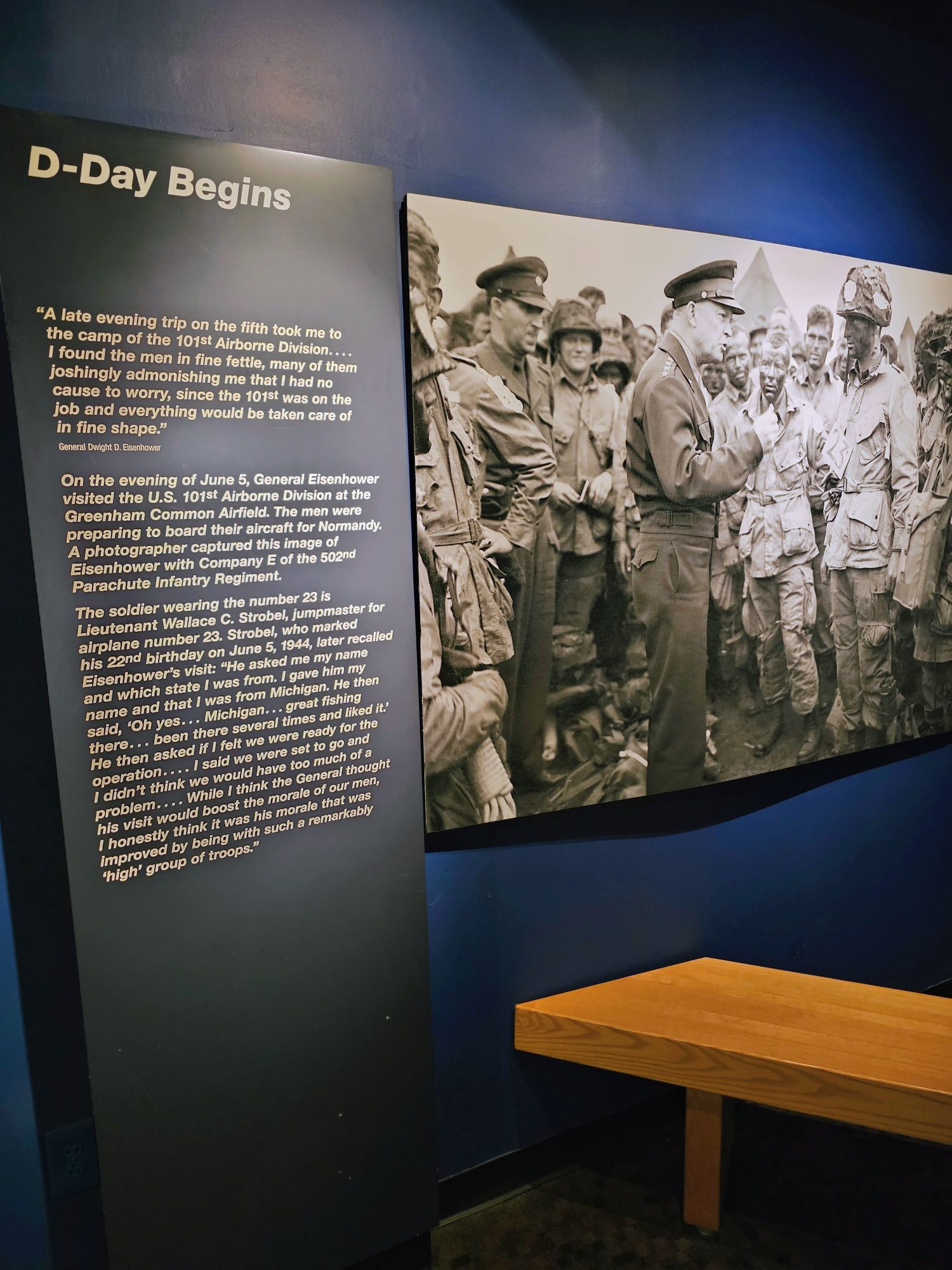 This photo of General Eisenhower talking with Lieutenant Wallace C. Strobel became an iconic photo depicting his incredible leadership. Lt. Strobel, chatting with the future President, is just 2 hours away from boarding his plane and leading his paratroopers into battle behind enemy lines on D-Day.