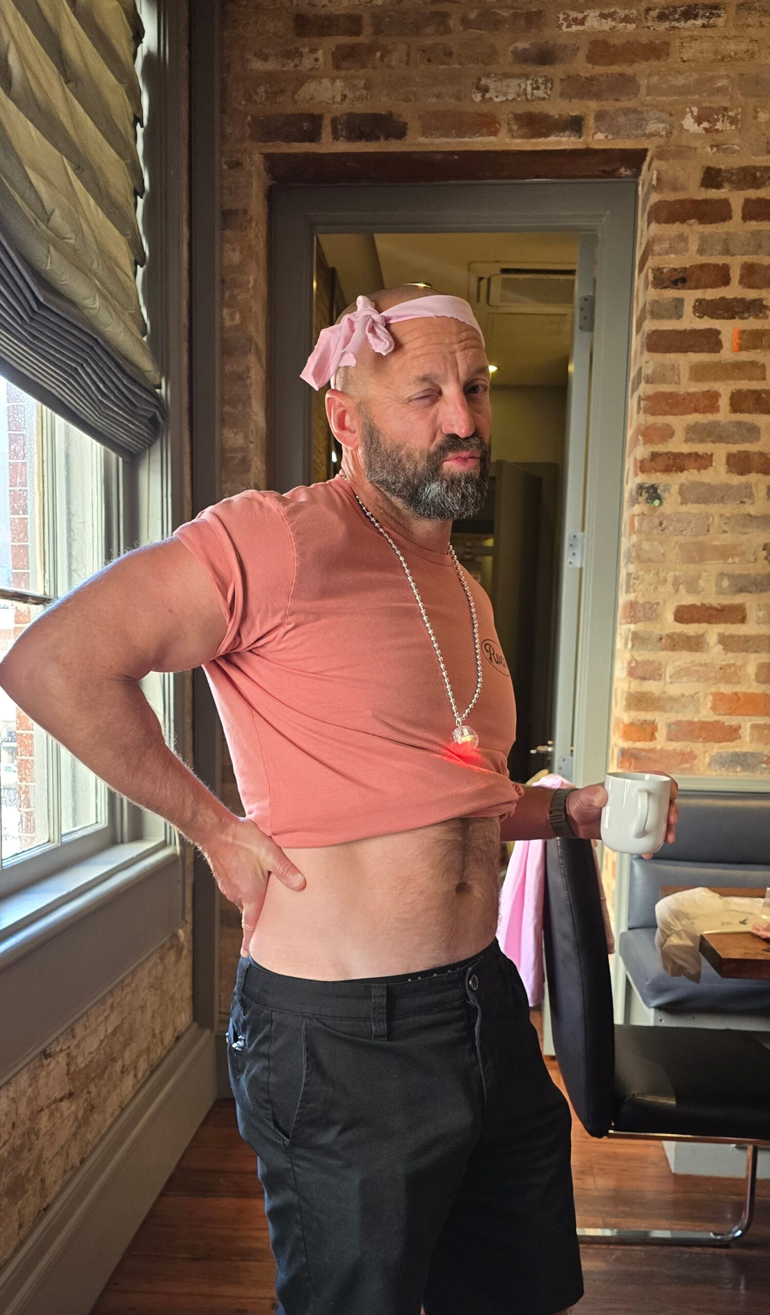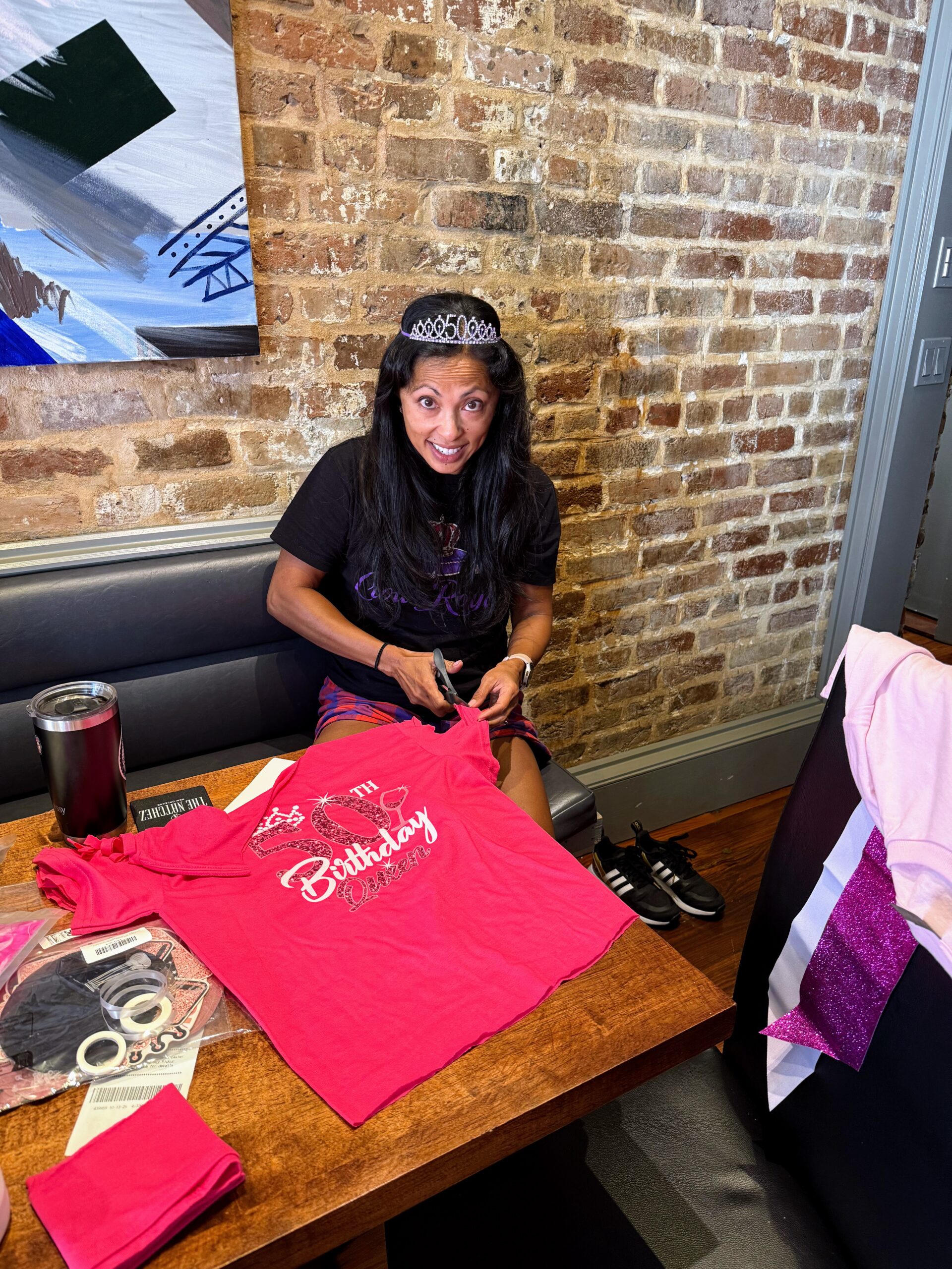 The next morning the ladies were prepping matching shirts for Myra’s birthday. Here is Myra doing some custom tailoring! Note the “50” on her tiara.