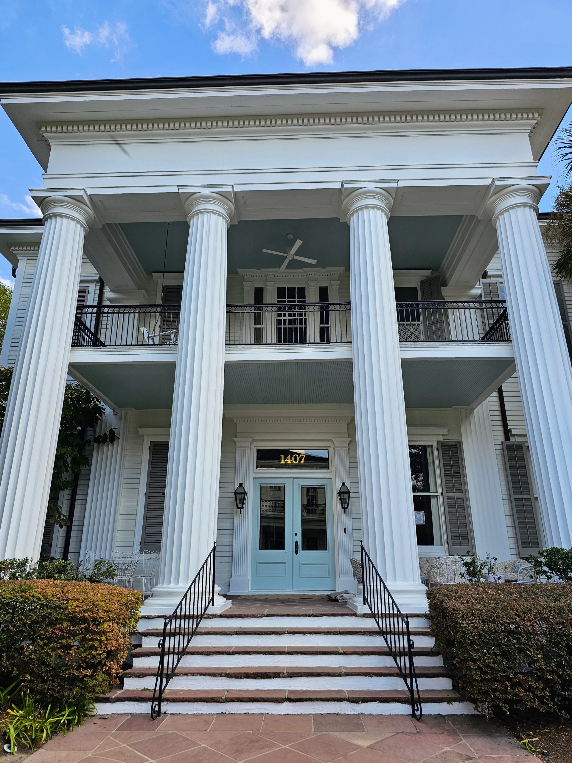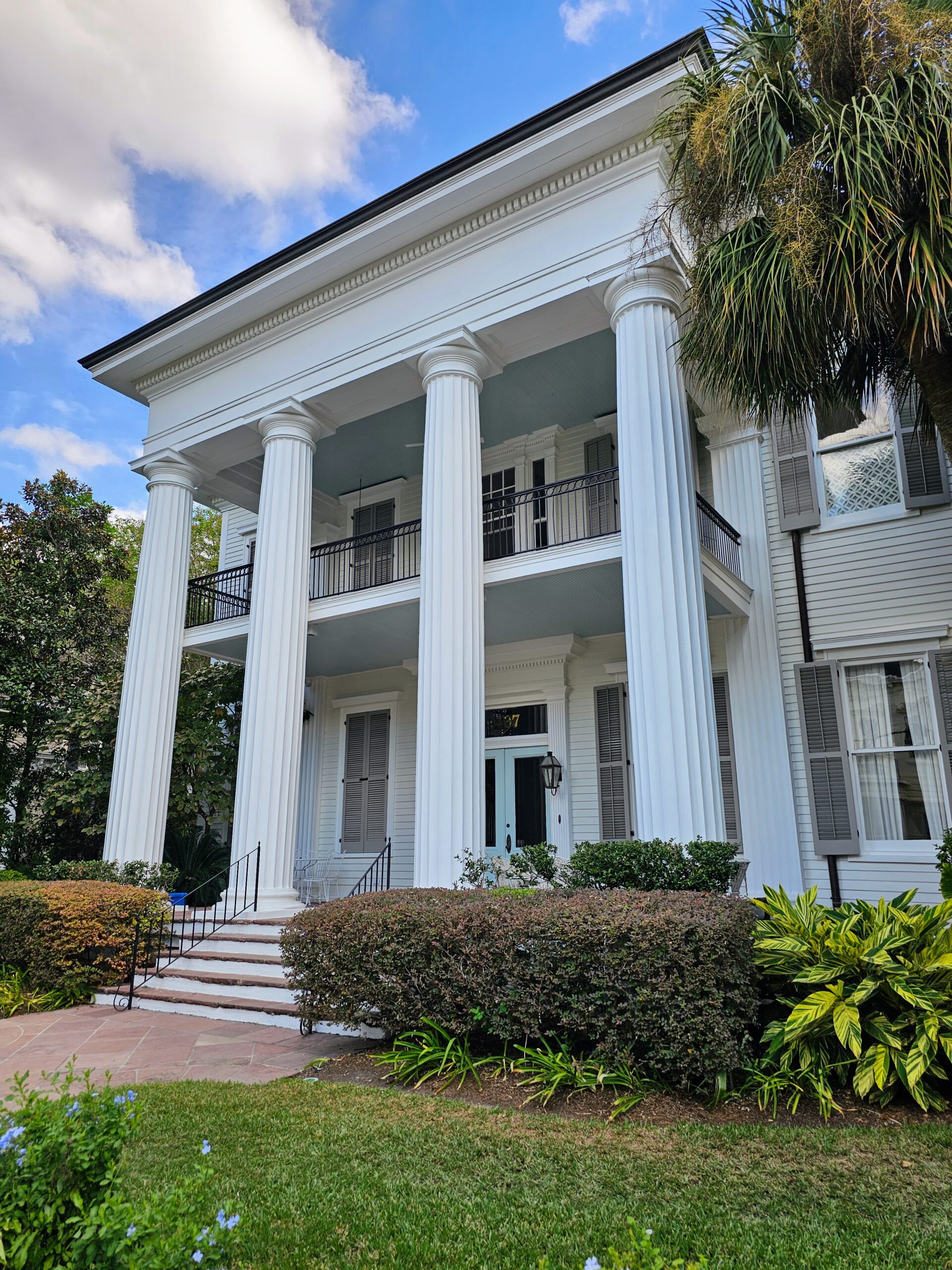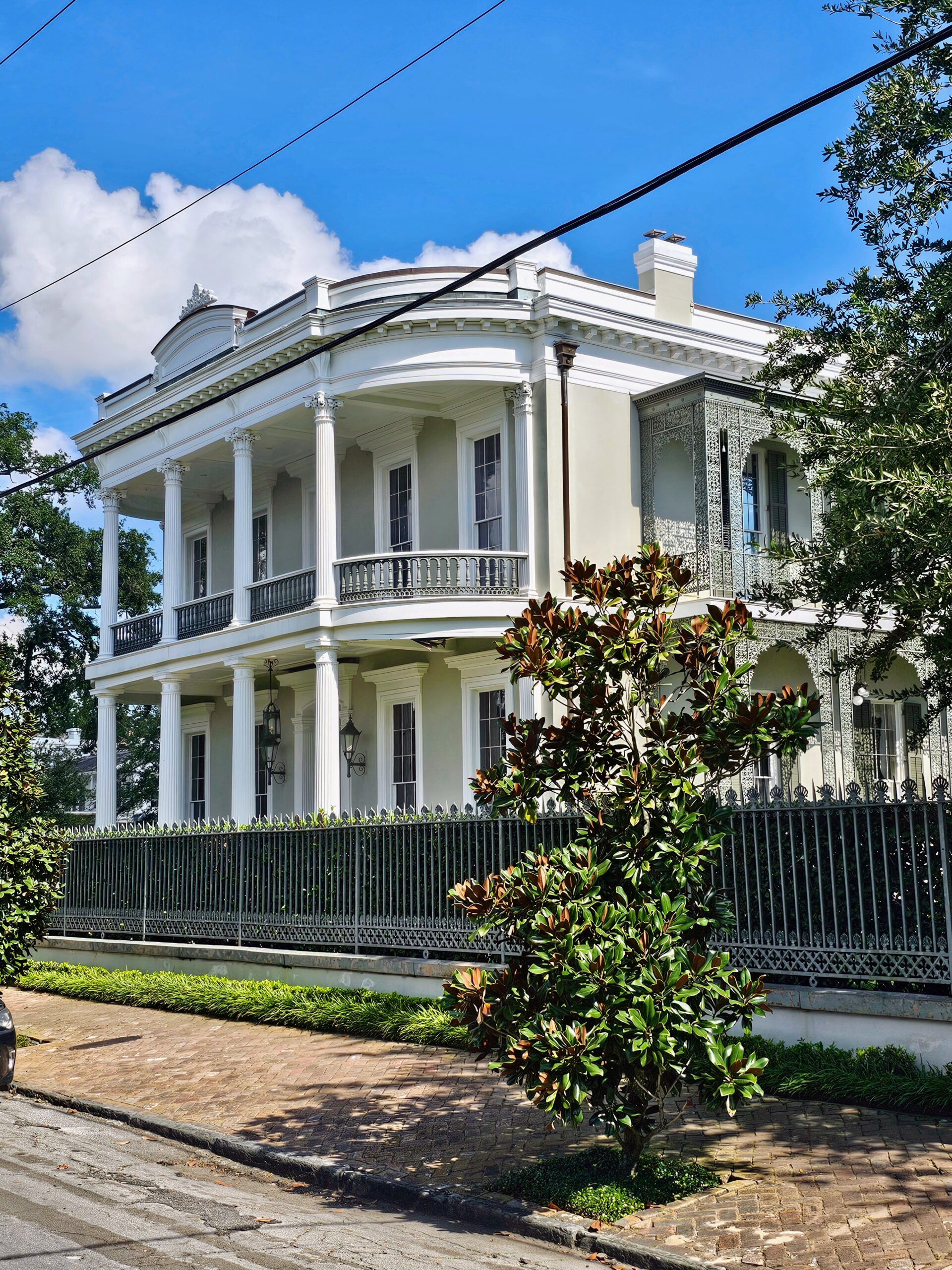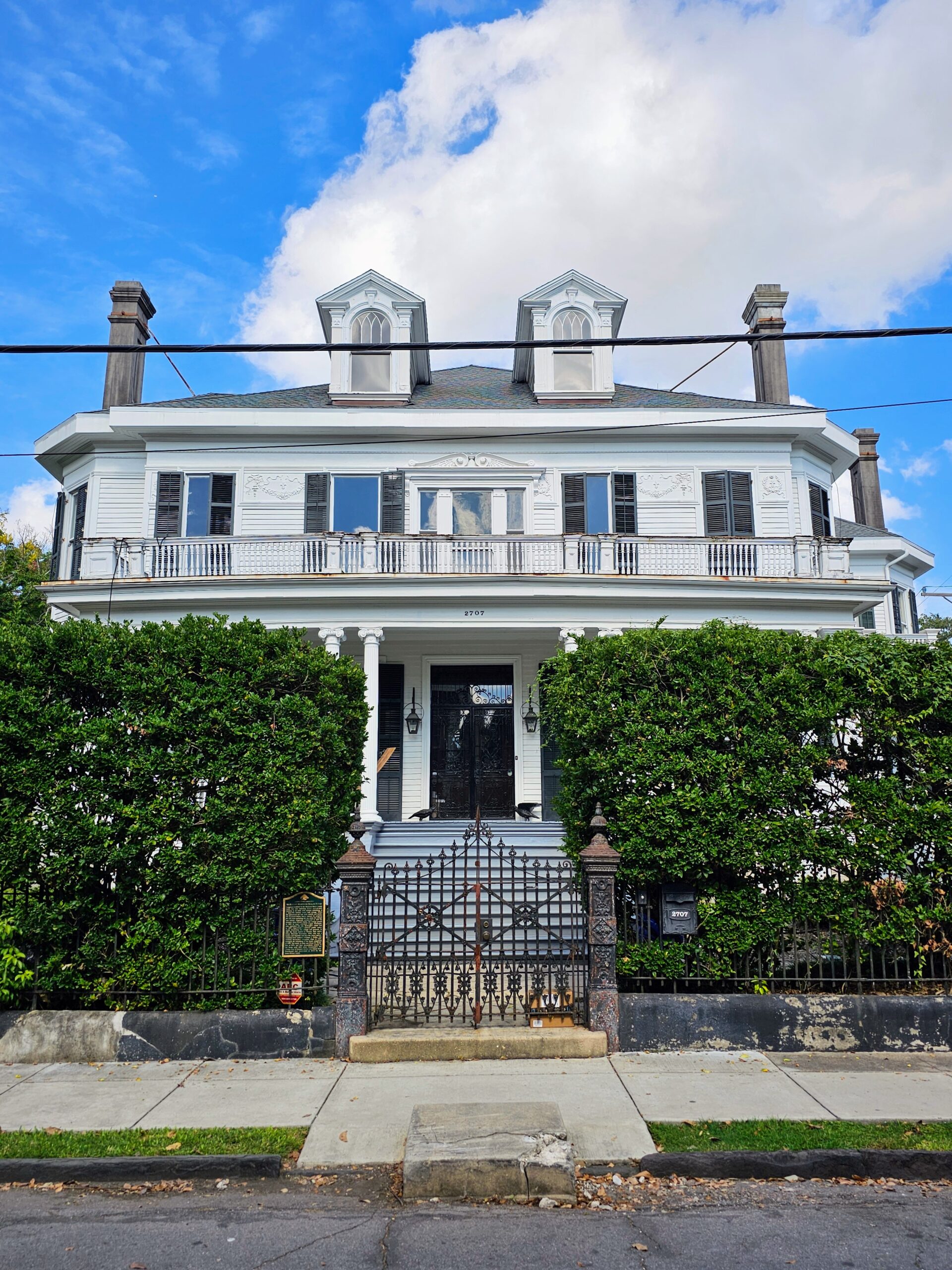 Here is another shot from the direct front of the house. Note the color of the ceilings on both the lower and upper porches, which is known as “haint blue”. This color is said to ward off evil spirits, a tradition brought to the south by the Gullah people , descendants of enslaved people from west and central Africa. Nearly every home on the Garden District has this haint blue paint on the porch ceilings.