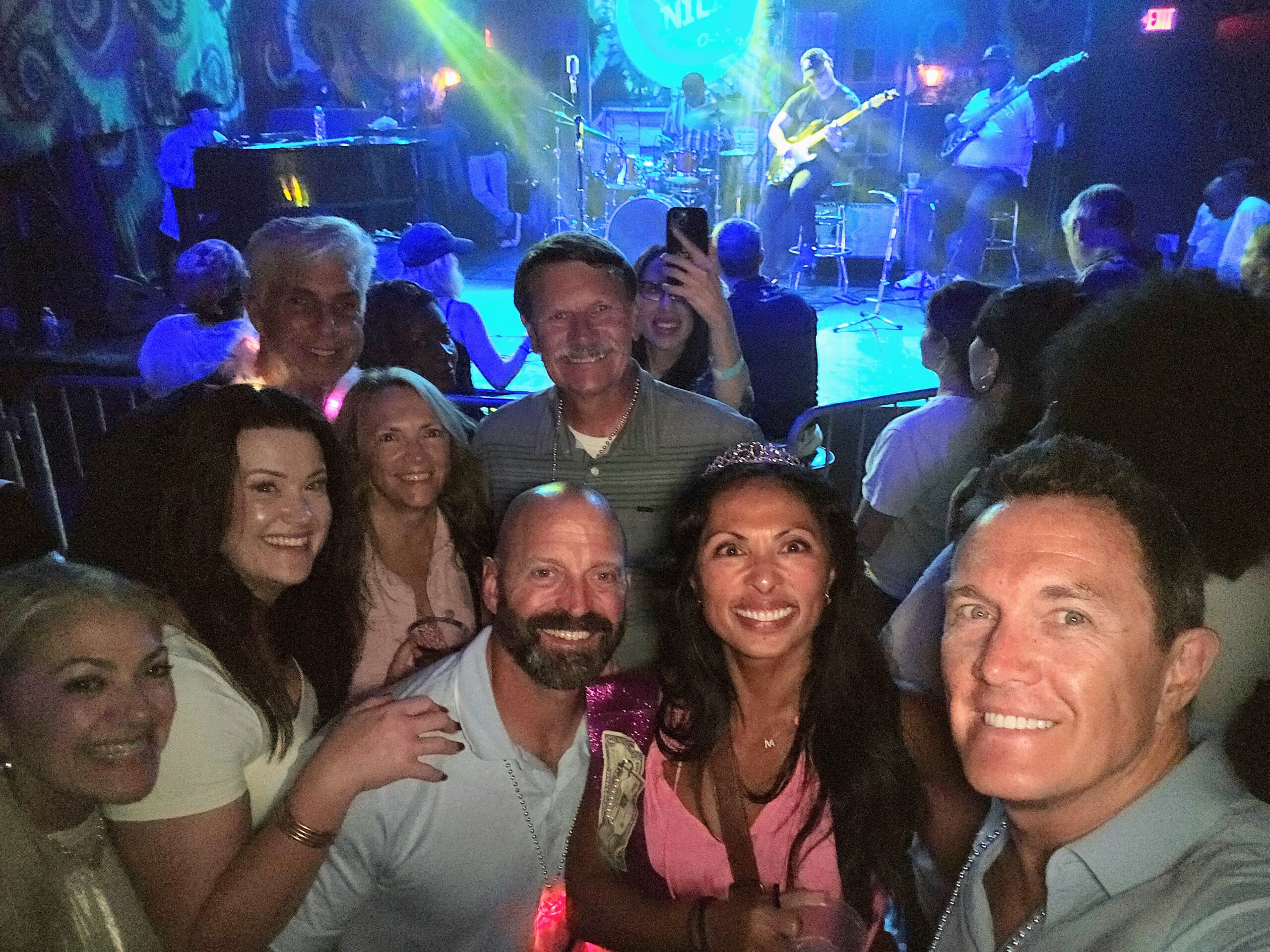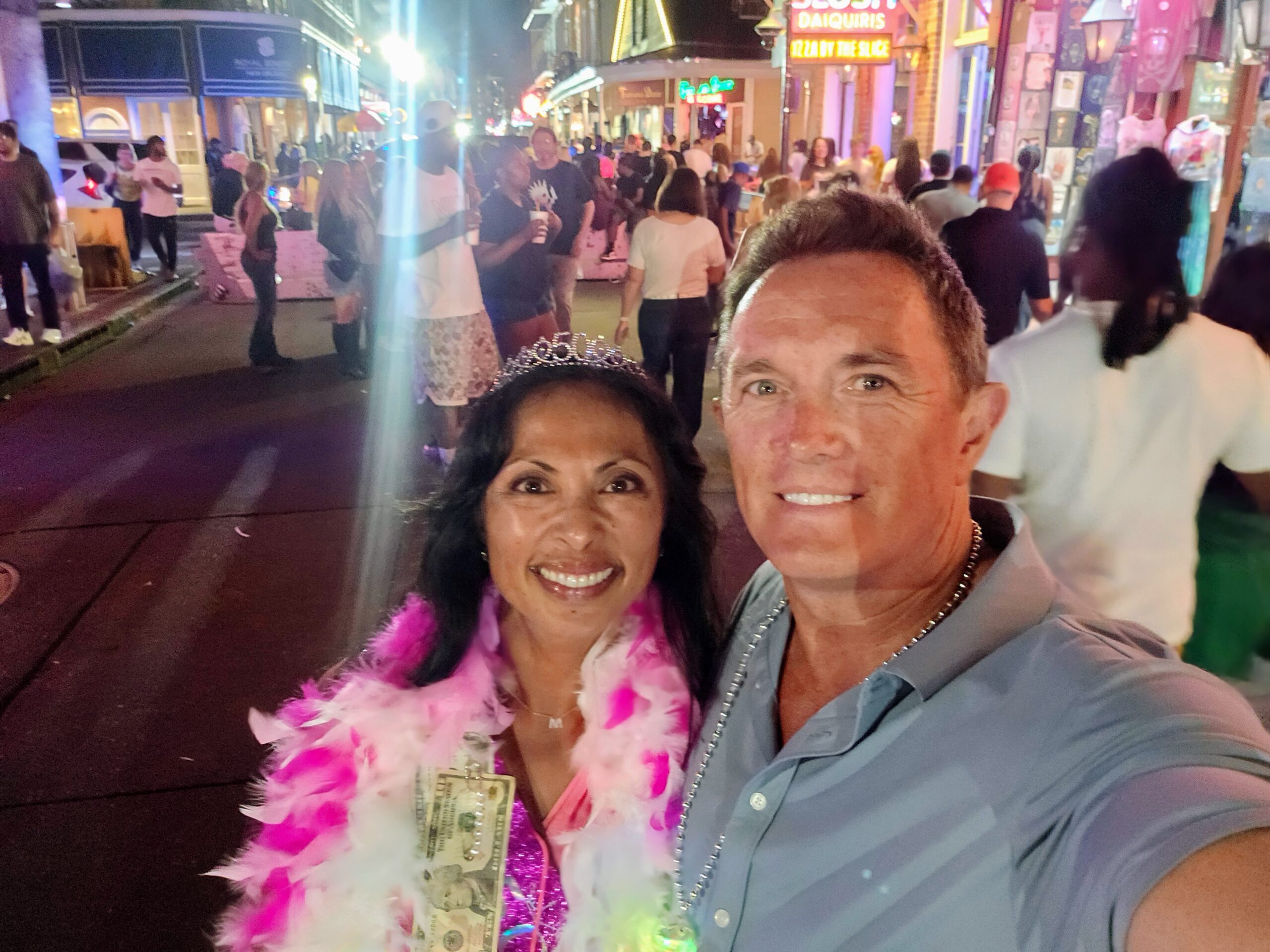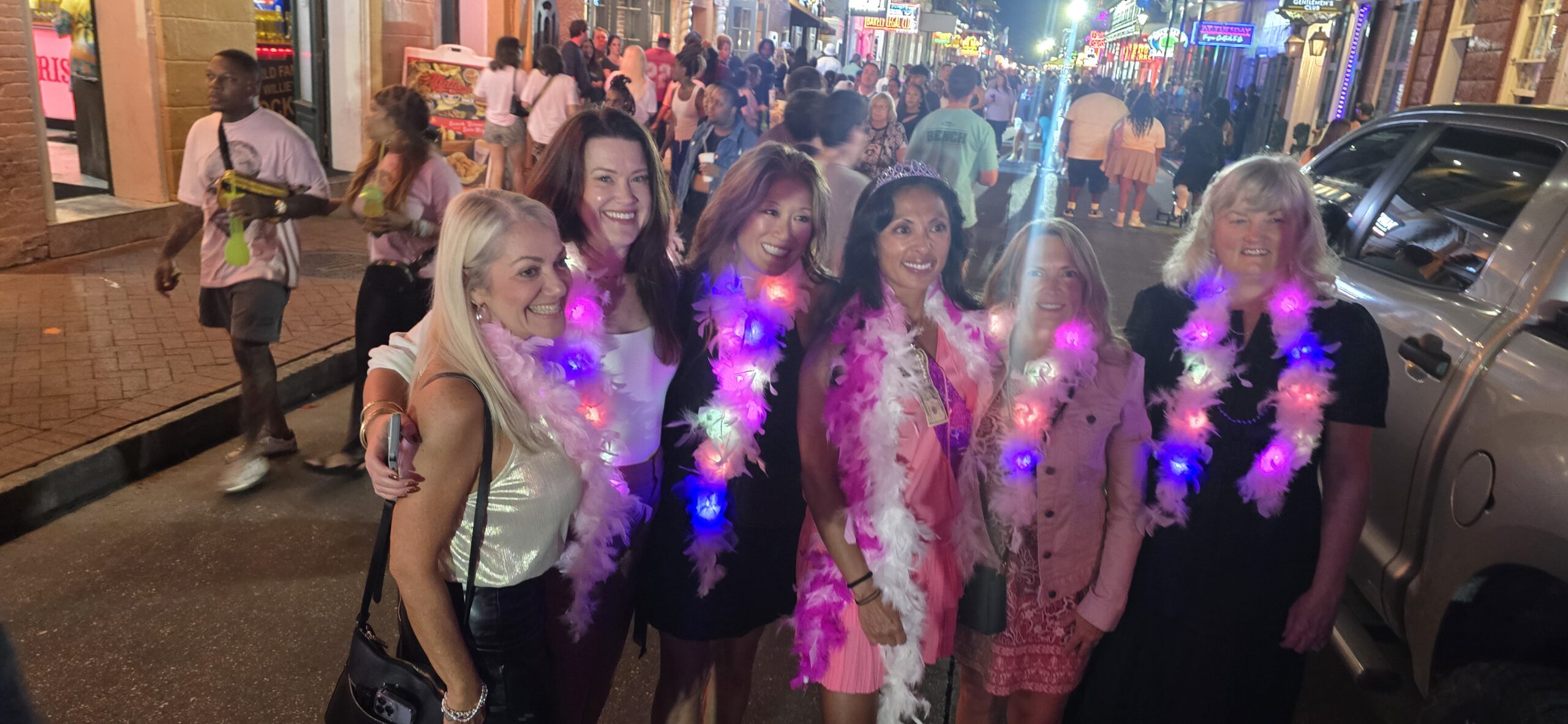 We then walked down Bourbon Street toward Frenchman Street, where we planned to hit another jazz bar. Here are the ladies with their birthday boas all lit up.